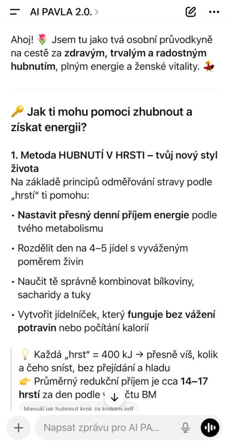 Jsem první česká expertka na hubnutí, která v březnu 2025 vypustila do světa svoji vlastní AI koučku PAVLU 2.0. – revoluční AI nástroj v oblasti personalizované podpory při hubnutí.