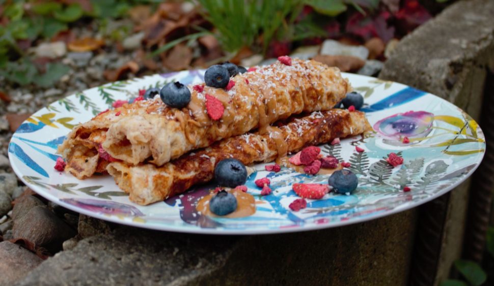 Vše smícháš dohromady a dáváš směs do rozpáleného vaflovače na (belgické vafle), vymazávat už nemusíš. Pečeš ve vaflovači cca 3 minutky a je to. Teplou vafli sroluješ jako palačinku, přeliješ mandlovým máslem a přidáš ovoce. Můžeš ještě posypat kokosem.
